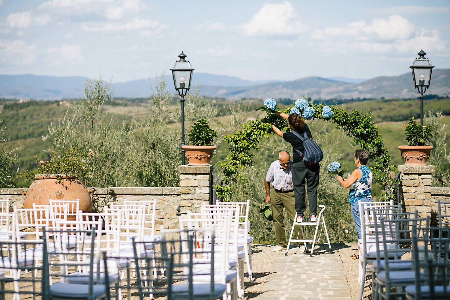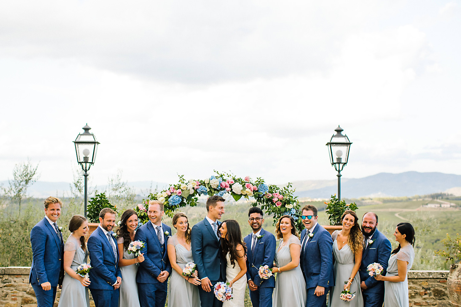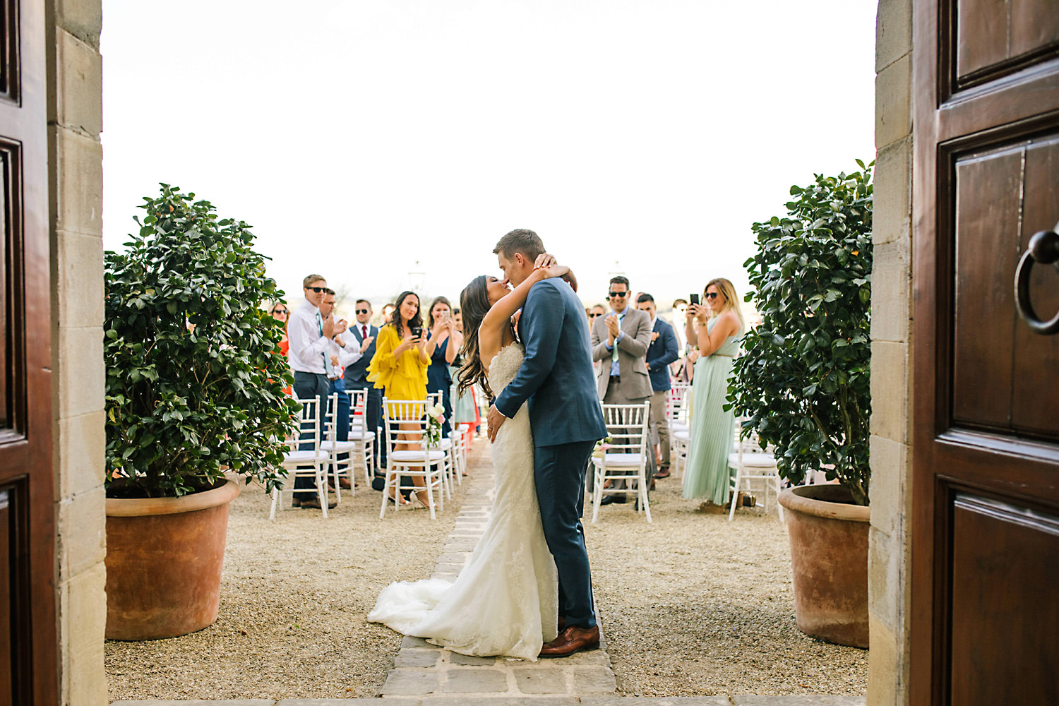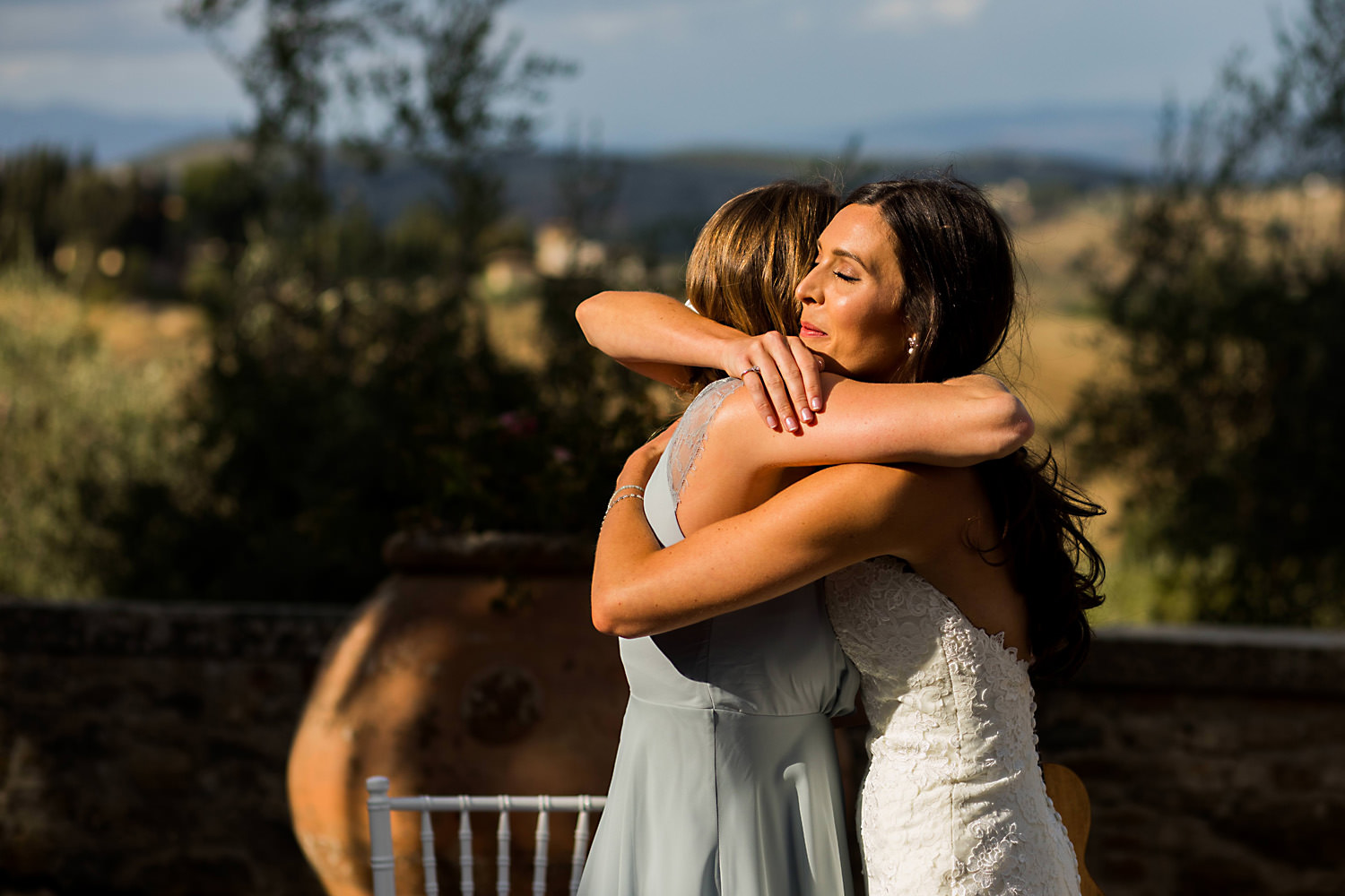 Most weddings abroad in the summer are late in the afternoon around 4pm onwards when the sun and temperature has dropped a little… and as I well know the weather in Tuscany can change rapidly, you can often see rain clouds coming over the mountains and before you know it they are on top of you with really heavy rain showers. About half an hour after the ceremony the sky looked like it was going to change so we quickly got group shots and Bride and Groom portraits done just in time as there was an almighty storm at night!