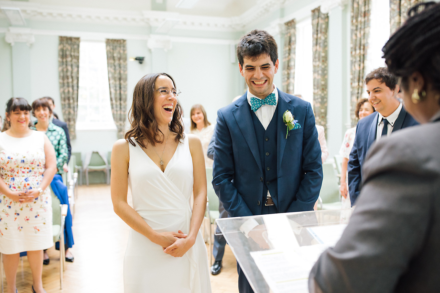 On the late morning of the wedding I made my way to Gabi and Santi’s apartment near Wood Green in London. Here I captured the relaxed atmosphere of Gabi with her Mum and Sisters. As we made our way to the wedding registry office Gabi said that she was going against wedding traditions and was to meet Santi for a ‘first look’. They spent a few moments together before heading into the ceremony and walking down the aisle together. George Meehan House is a lovely light and airy wedding venue, after the ceremony we headed outside for confetti and formal group photographs. A White cab had been arranged to pick up the newlyweds and the guests hopped on a coach off to Boulestin restaurant where they enjoyed beers and cocktails whilst they waited for the new Mrs and Mrs to arrive. Myself and the videographer took the opportunity to stop off at Hampstead Heath with the bride and groom for 20 minutes so they could enjoy some time together as we captured some relaxed documentary photographs of them both.