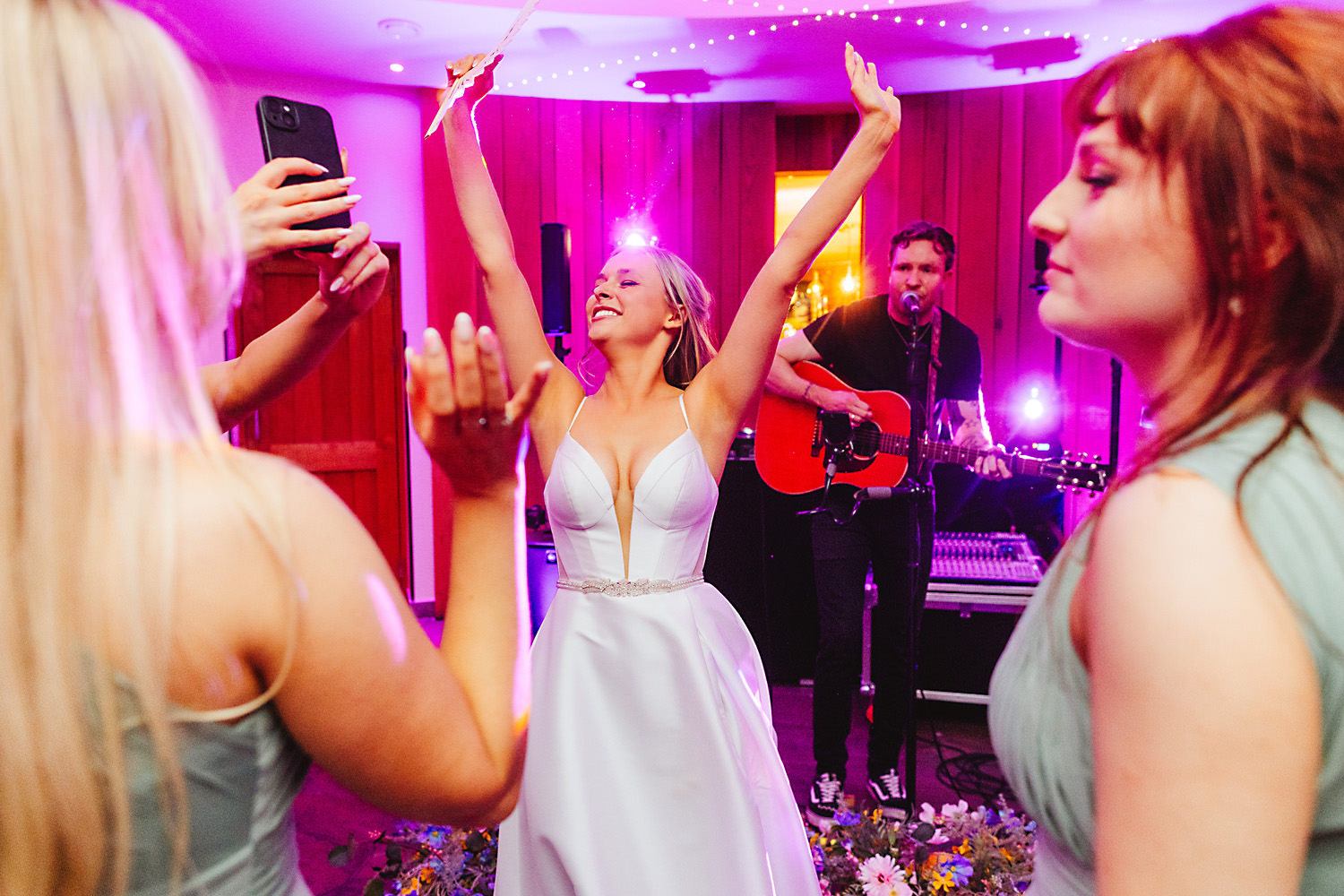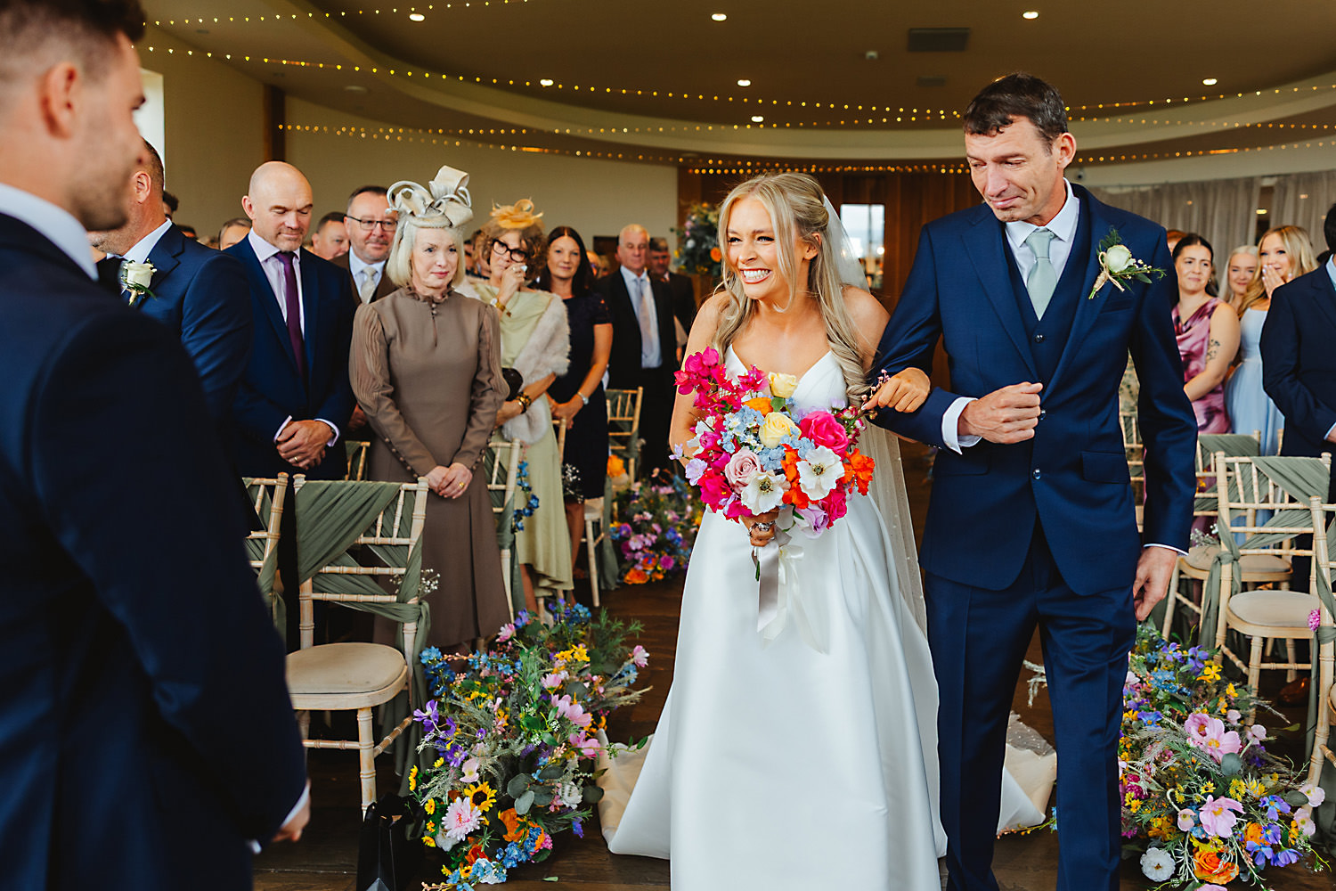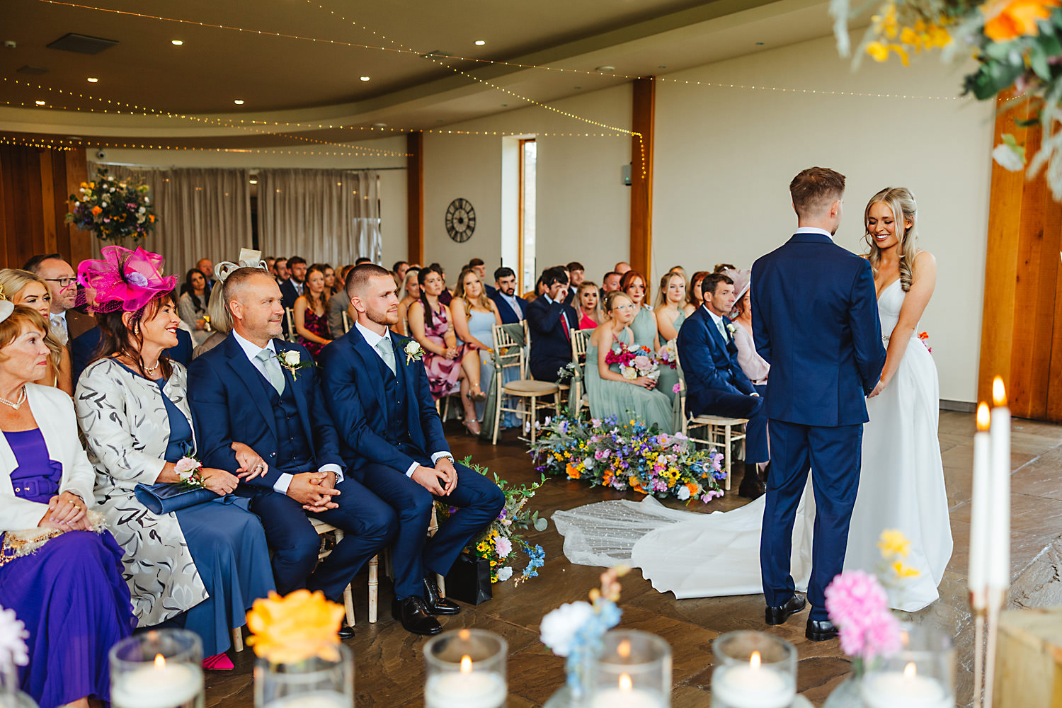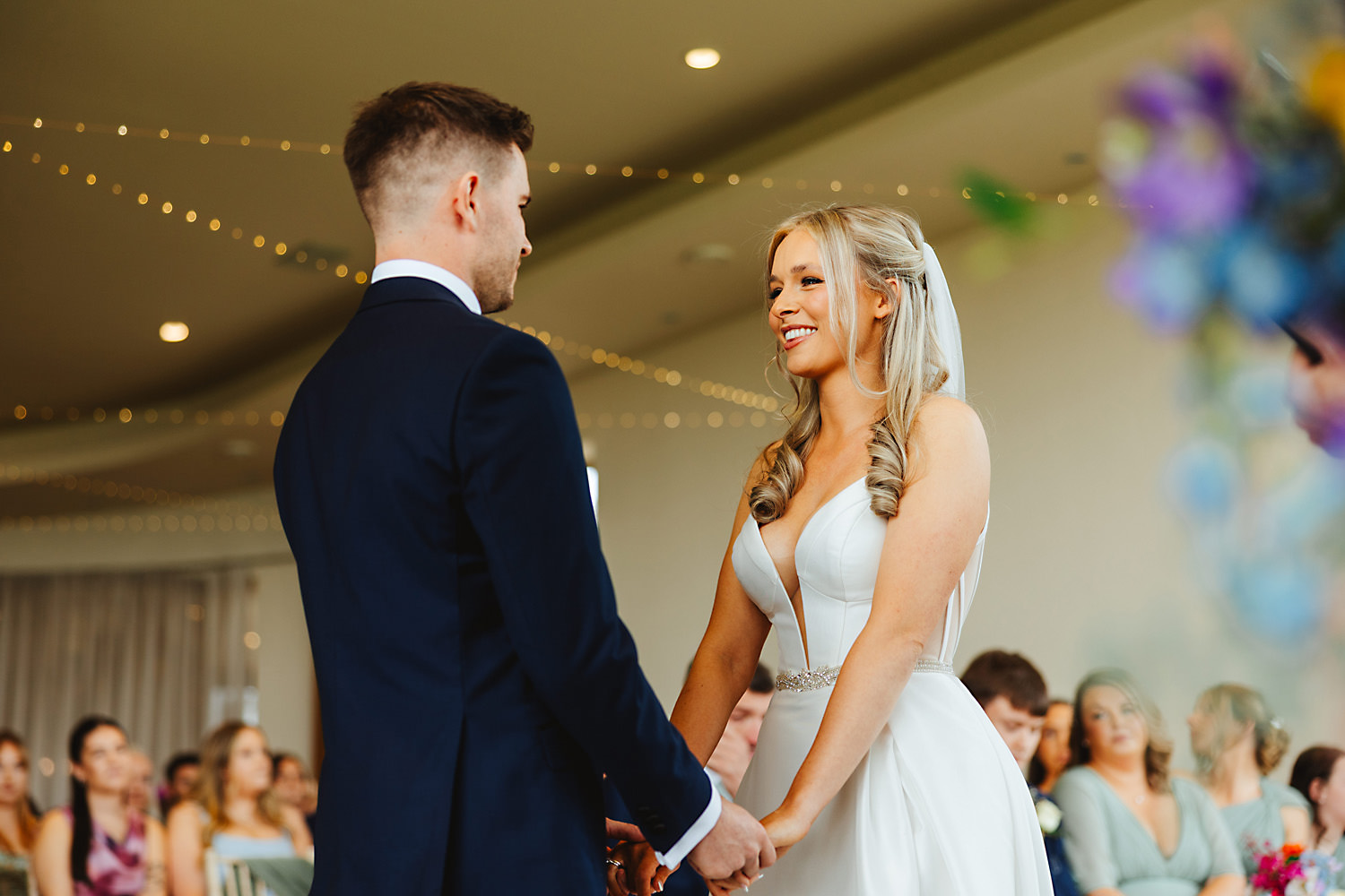 There were so many lovely things to look at in the venue. The bridesmaids were beautiful in their soft green one-shoulder dresses and bright colour-pop posies, and Olivia looked a million dollars in her pure white silk dress with a fitted bodice, spaghetti straps, and full skirt.