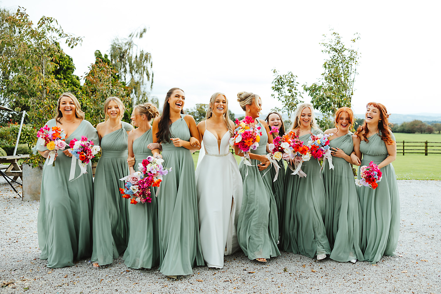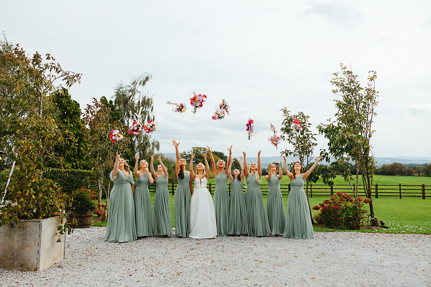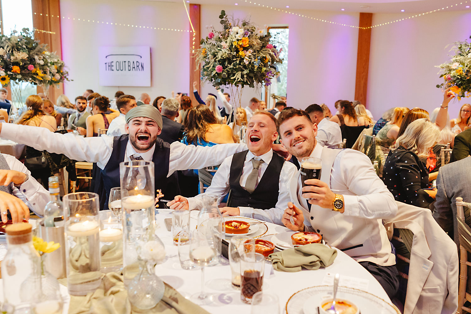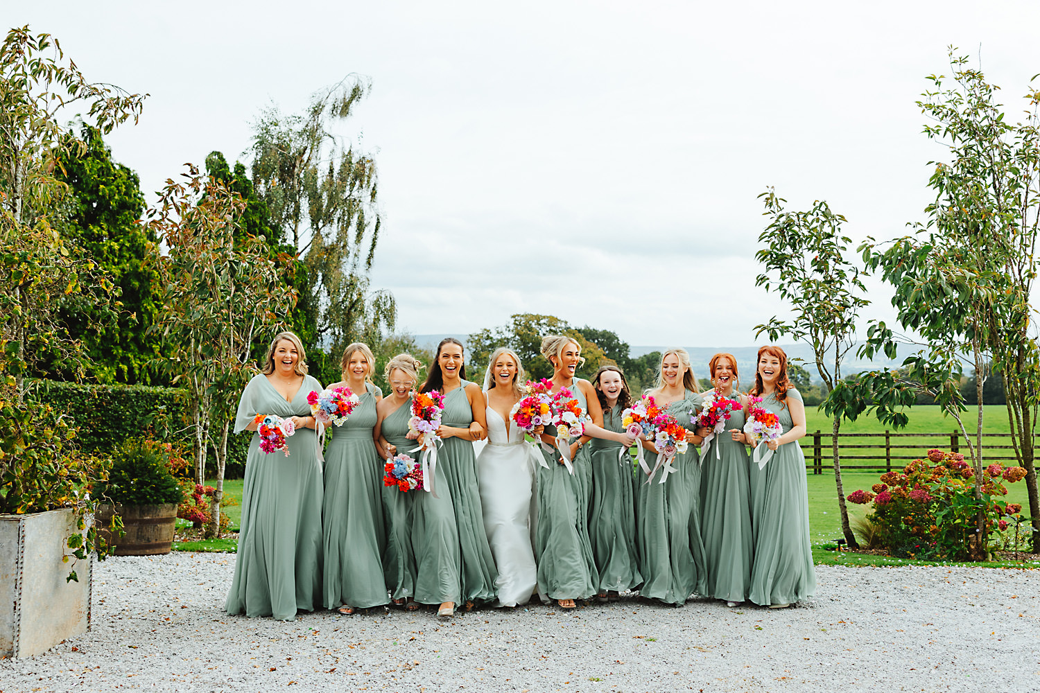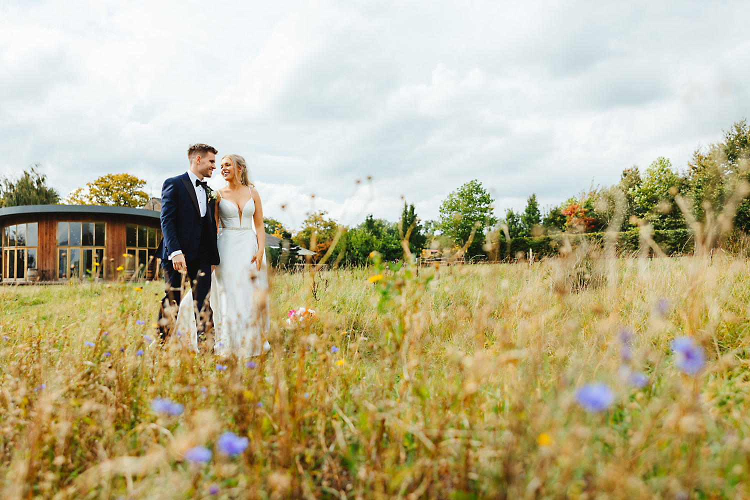 The venue was also dressed to perfection, with the most glorious colourful flowers, white linen, and sparkling glassware. It was great to get everyone outdoors, for some group shots, as the views are incredible from the Out Barn. Check out that blend of wildflower fields, manicured lawns, woodland areas, and incredible sweeping views. It really is the most magnificent venue.