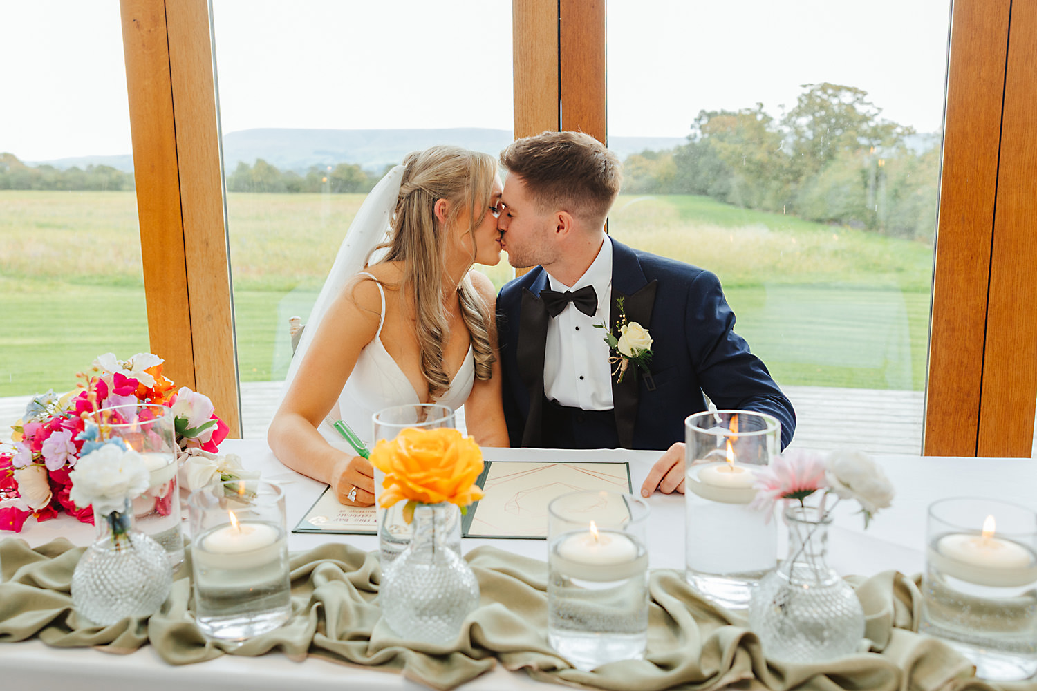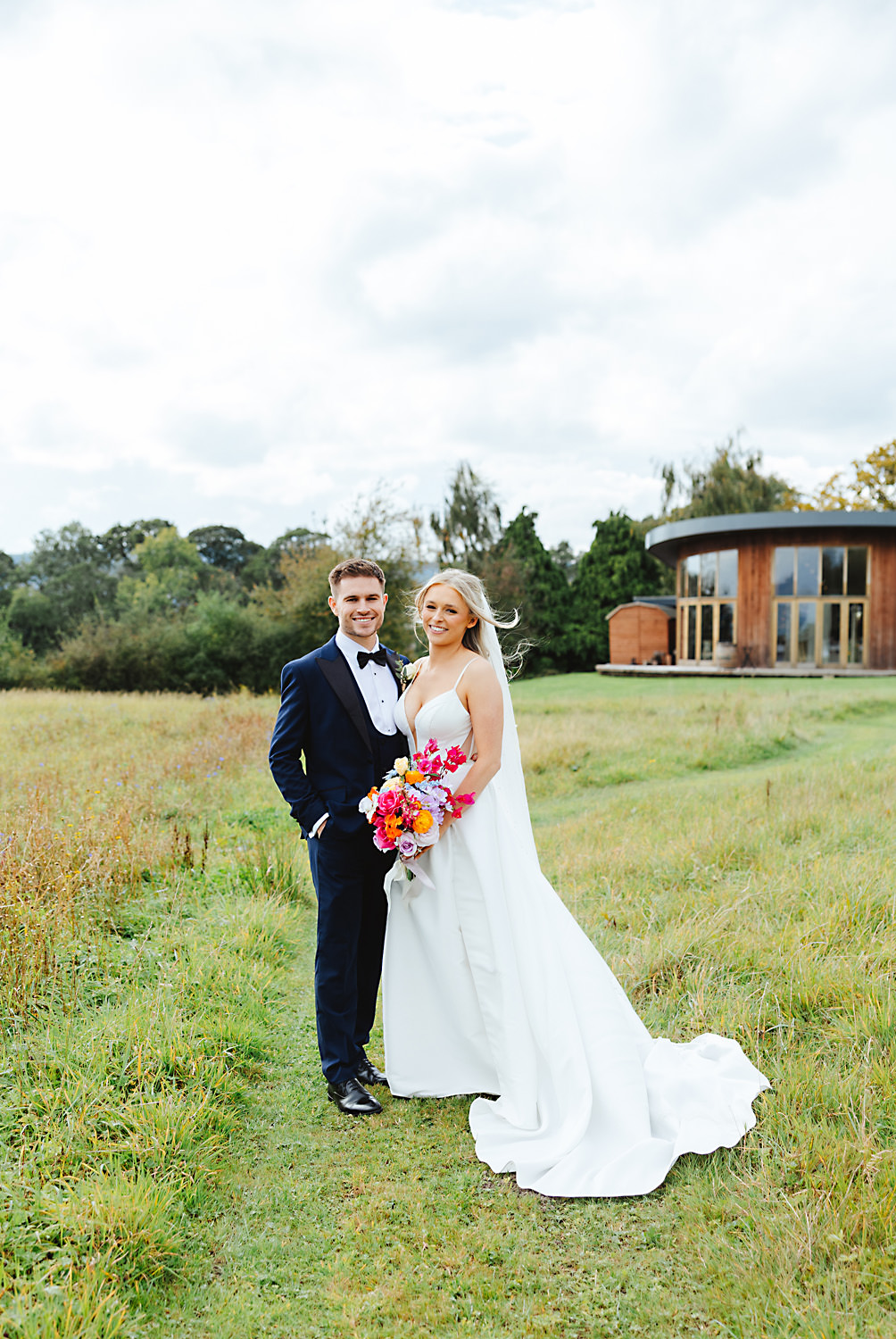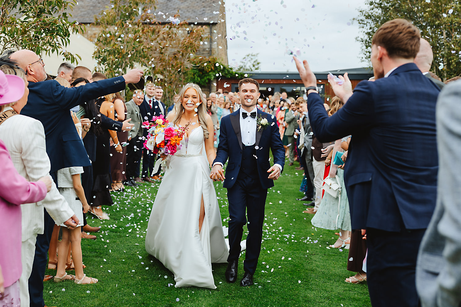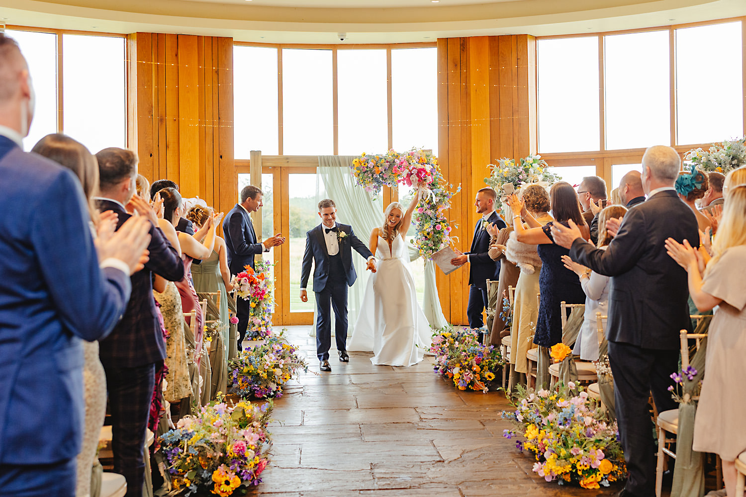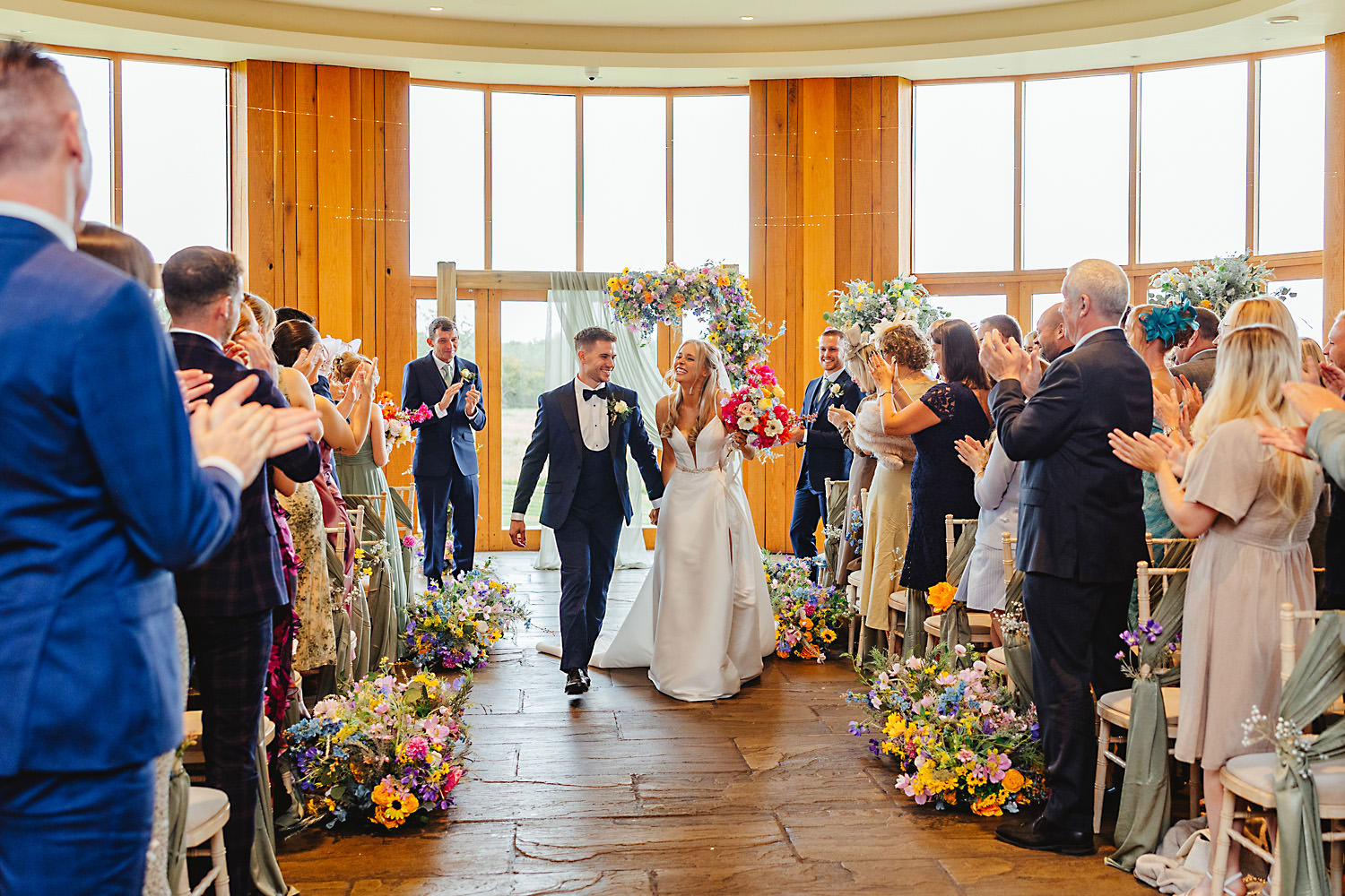The venue was also dressed to perfection, with the most glorious colourful flowers, white linen, and sparkling glassware. It was great to get everyone outdoors, for some group shots, as the views are incredible from the Out Barn. Check out that blend of wildflower fields, manicured lawns, woodland areas, and incredible sweeping views. It really is the most magnificent venue.