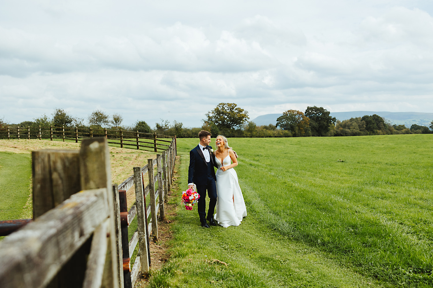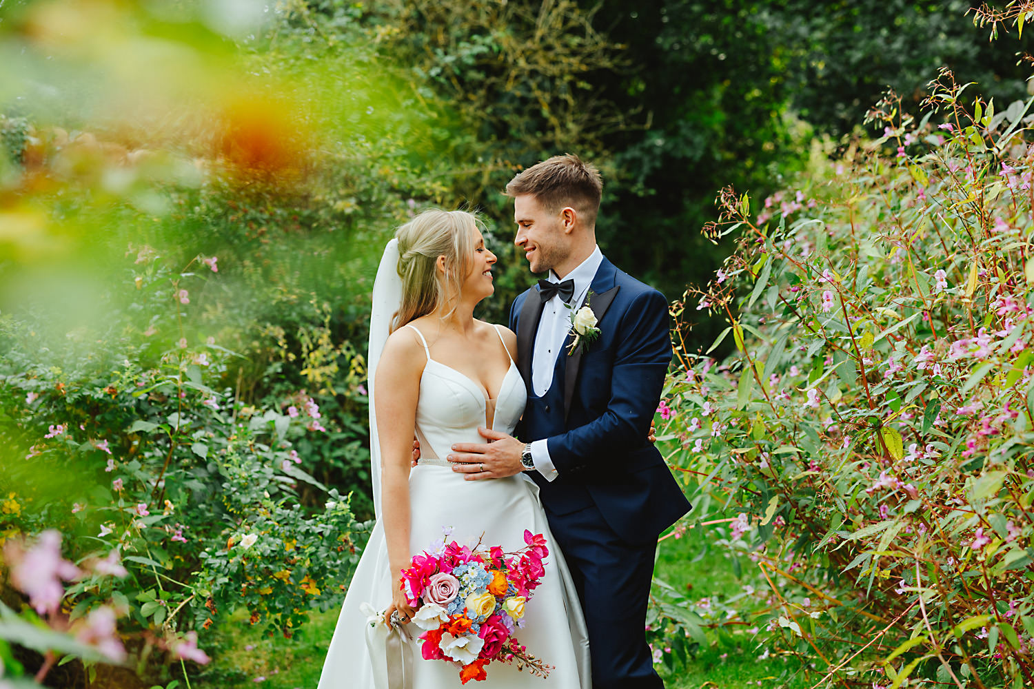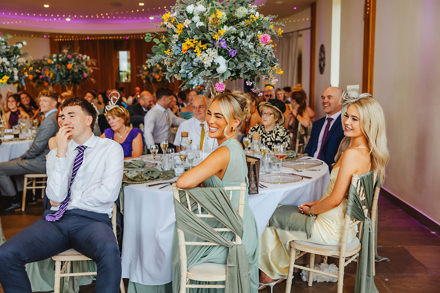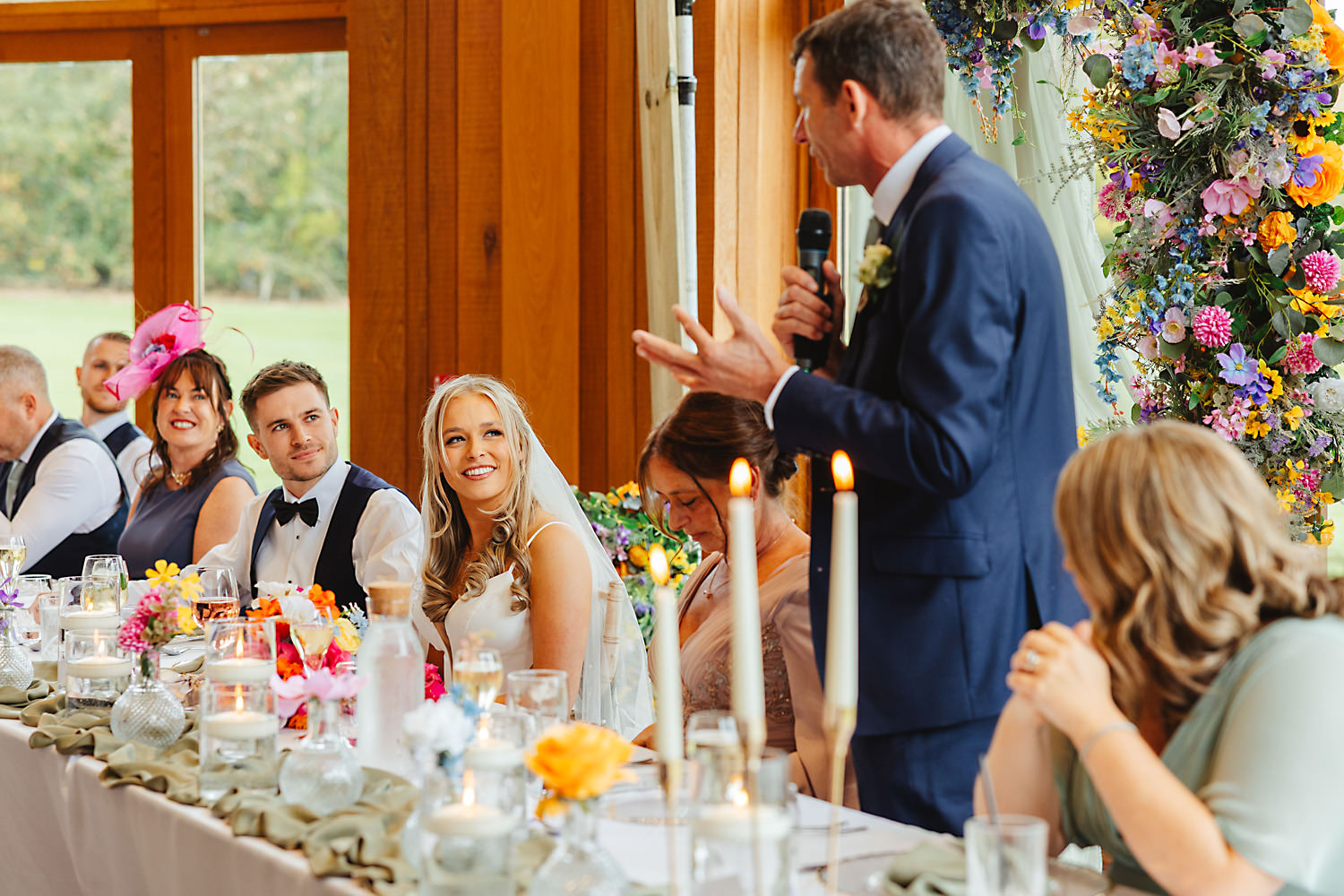 The venue was also dressed to perfection, with the most glorious colourful flowers, white linen, and sparkling glassware. It was great to get everyone outdoors, for some group shots, as the views are incredible from the Out Barn. Check out that blend of wildflower fields, manicured lawns, woodland areas, and incredible sweeping views. It really is the most magnificent venue.