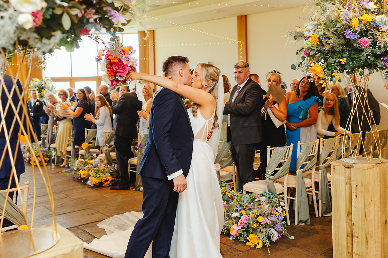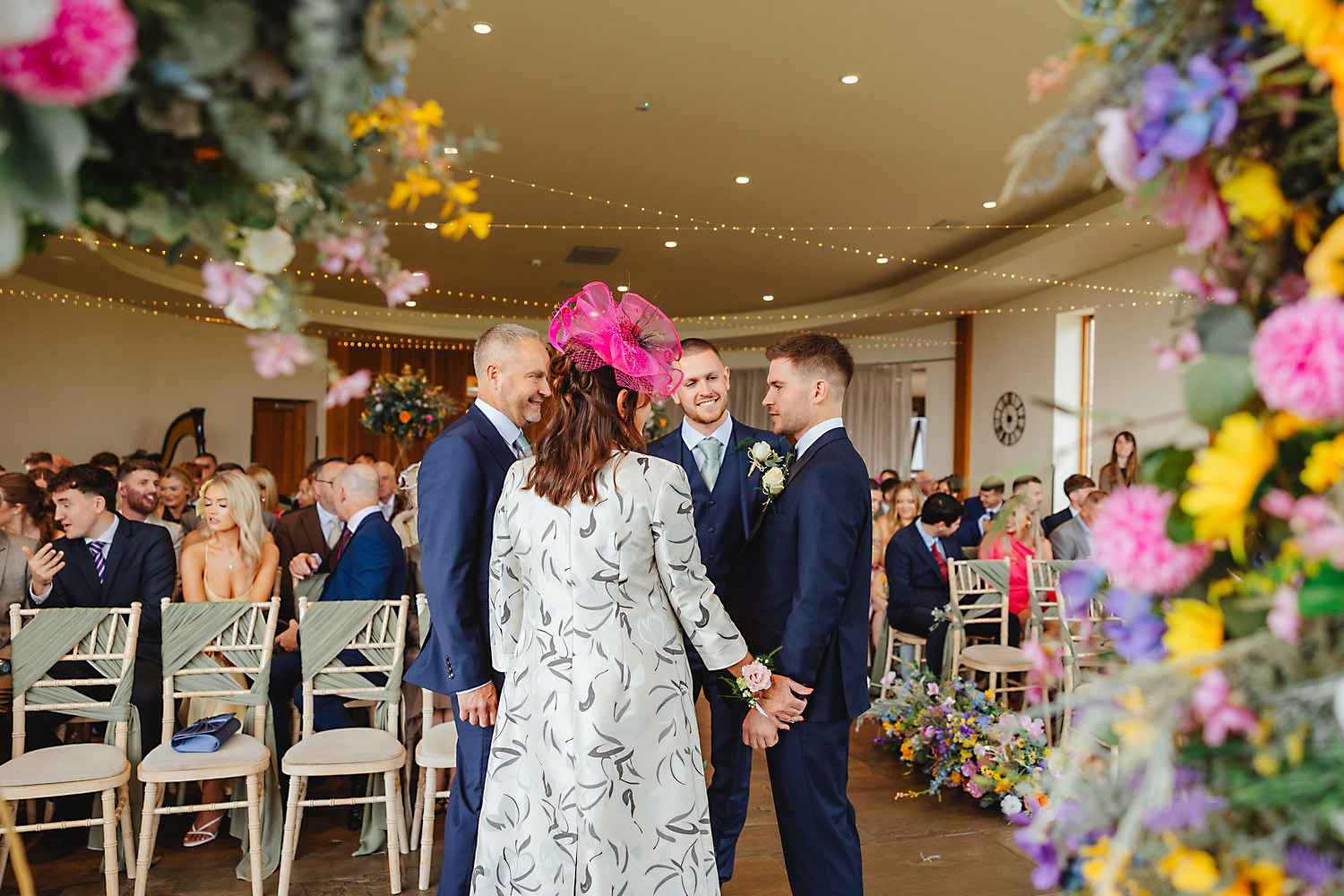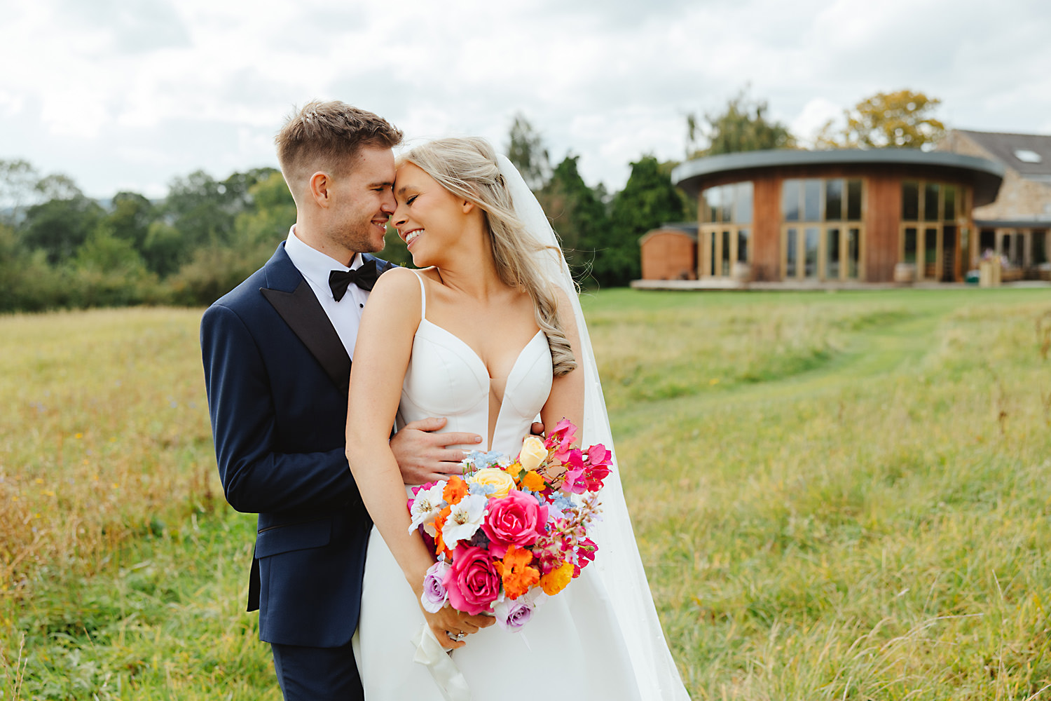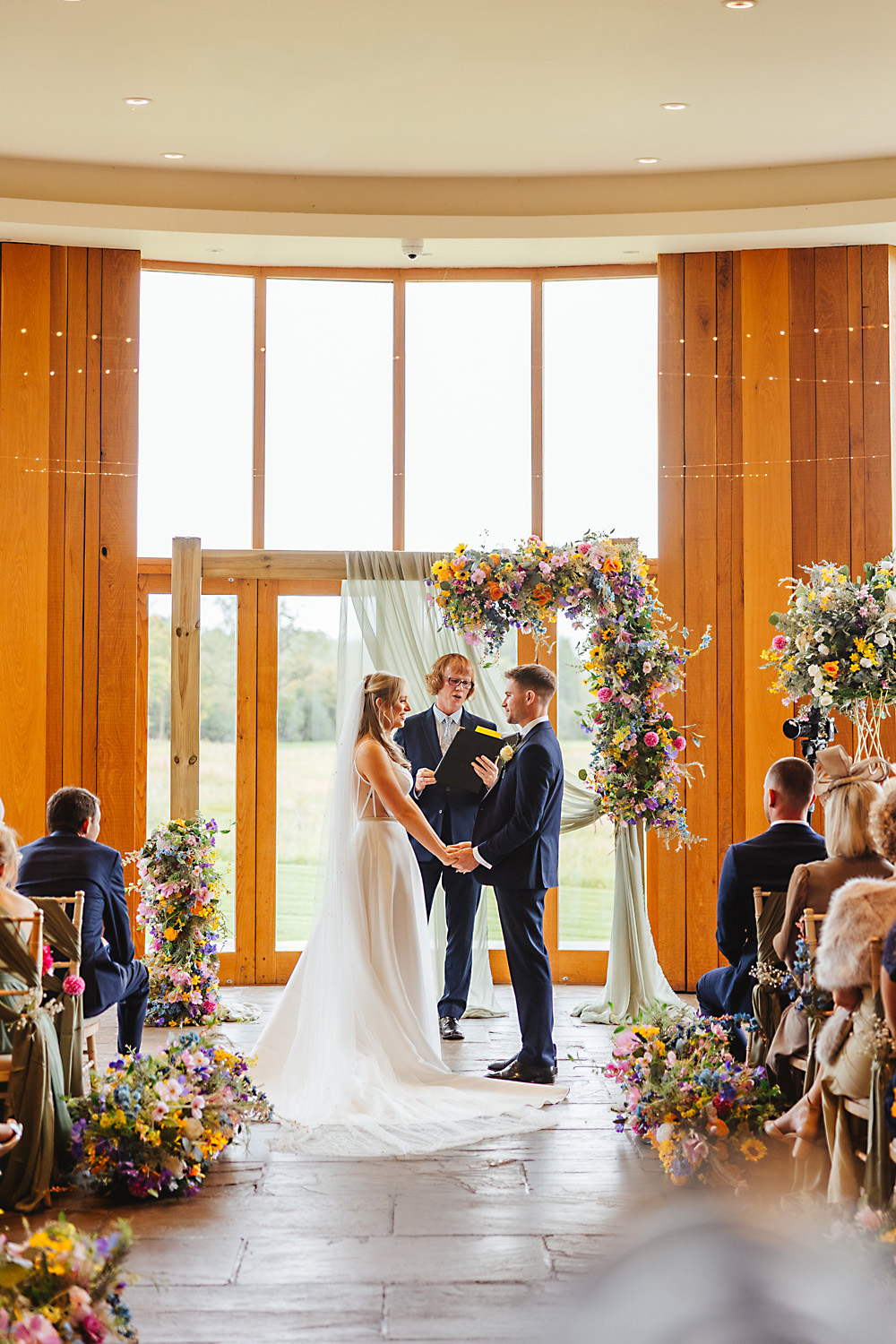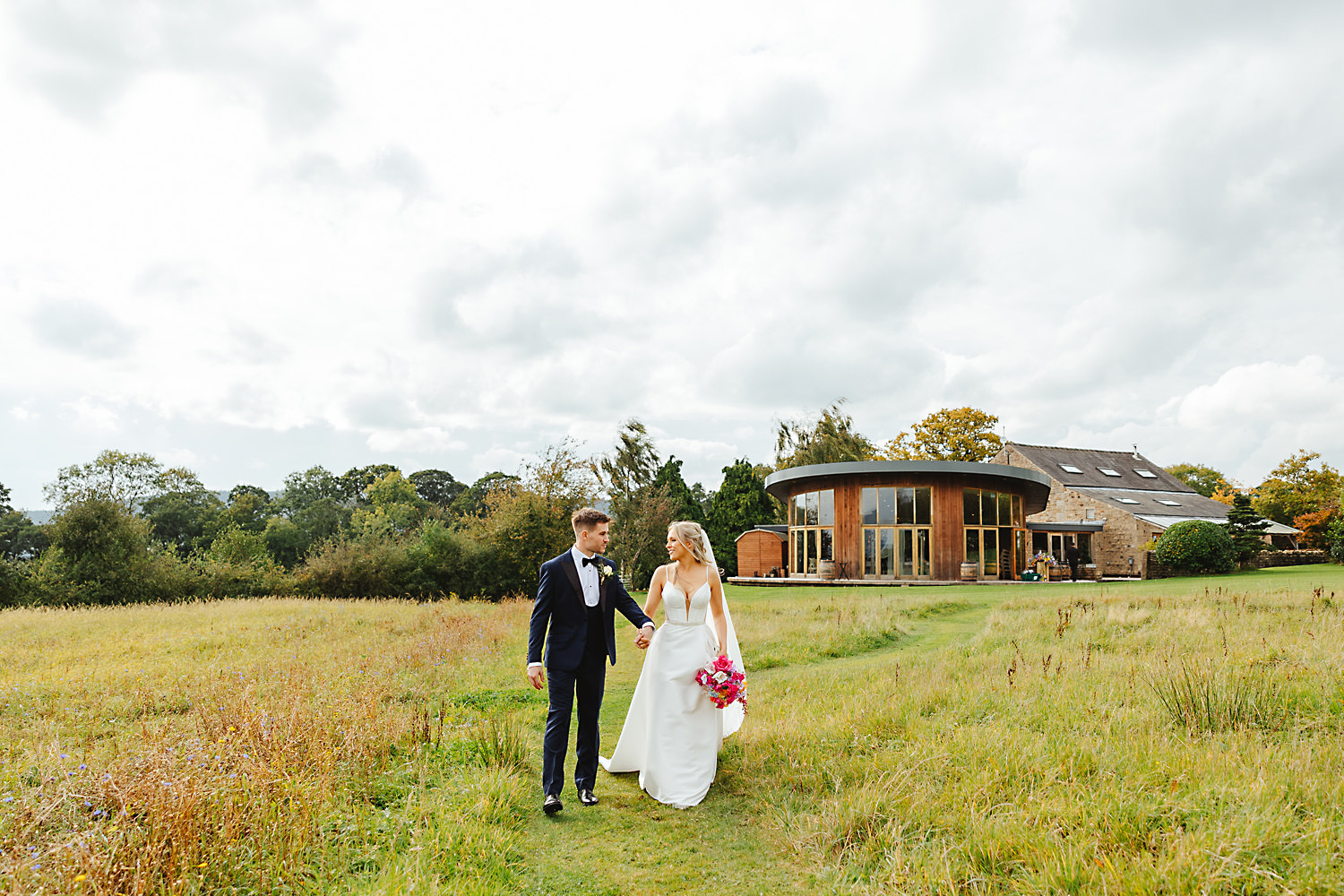 The venue was also dressed to perfection, with the most glorious colourful flowers, white linen, and sparkling glassware. It was great to get everyone outdoors, for some group shots, as the views are incredible from the Out Barn. Check out that blend of wildflower fields, manicured lawns, woodland areas, and incredible sweeping views. It really is the most magnificent venue.