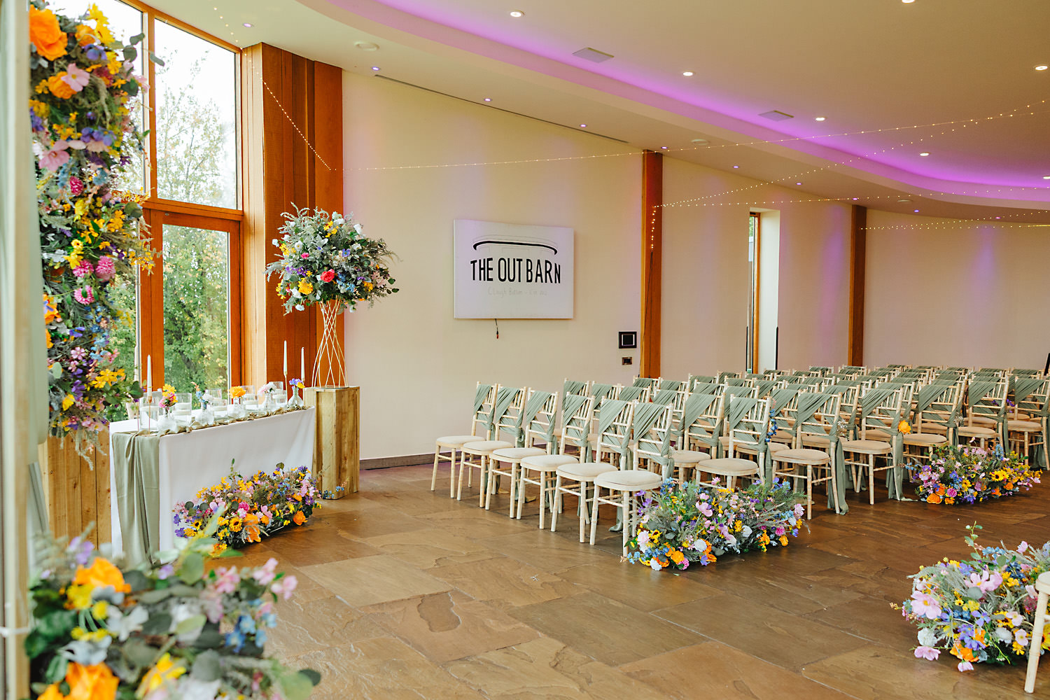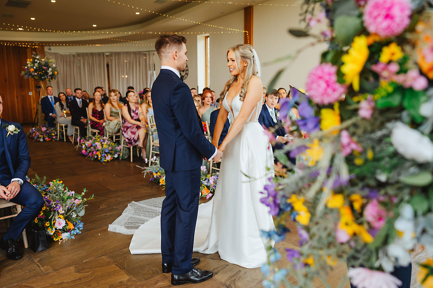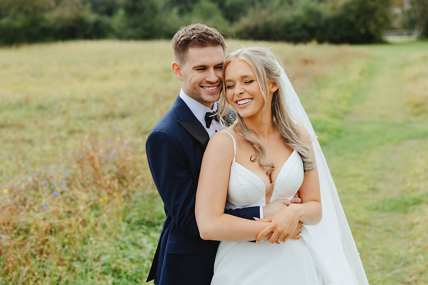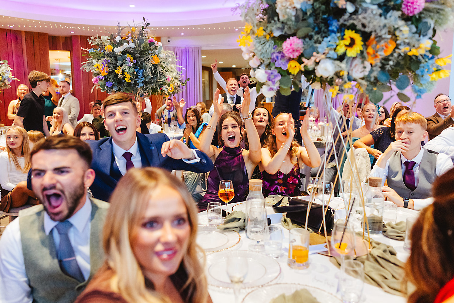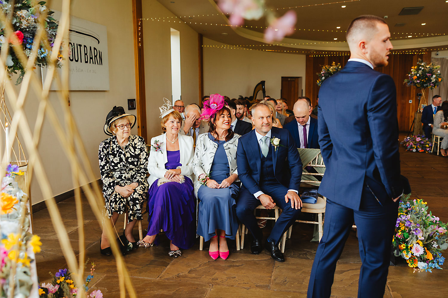 The venue was also dressed to perfection, with the most glorious colourful flowers, white linen, and sparkling glassware. It was great to get everyone outdoors, for some group shots, as the views are incredible from the Out Barn. Check out that blend of wildflower fields, manicured lawns, woodland areas, and incredible sweeping views. It really is the most magnificent venue.