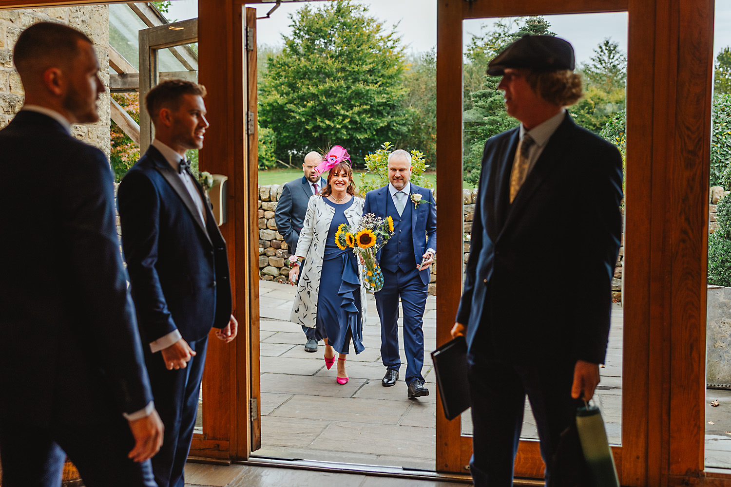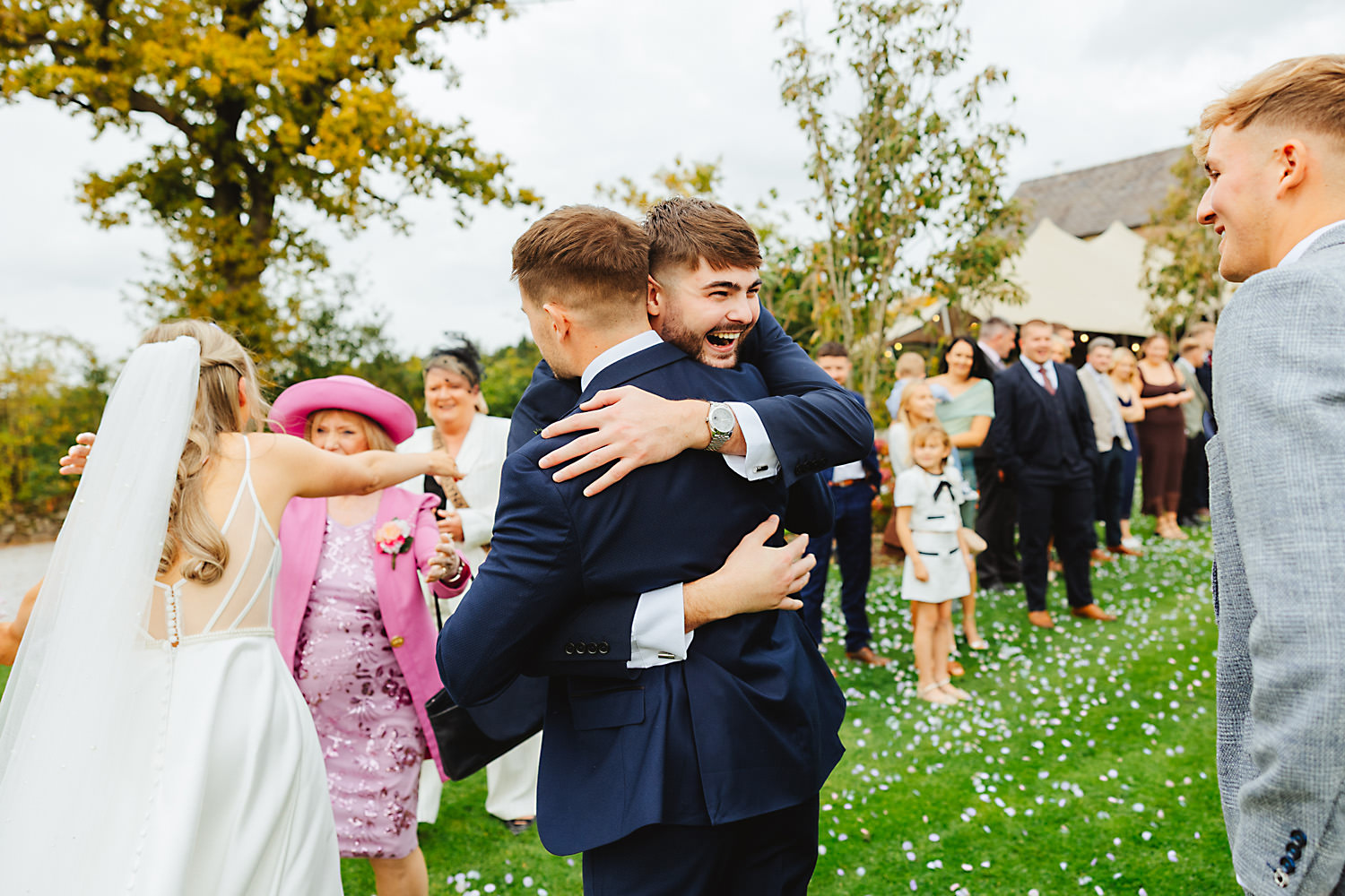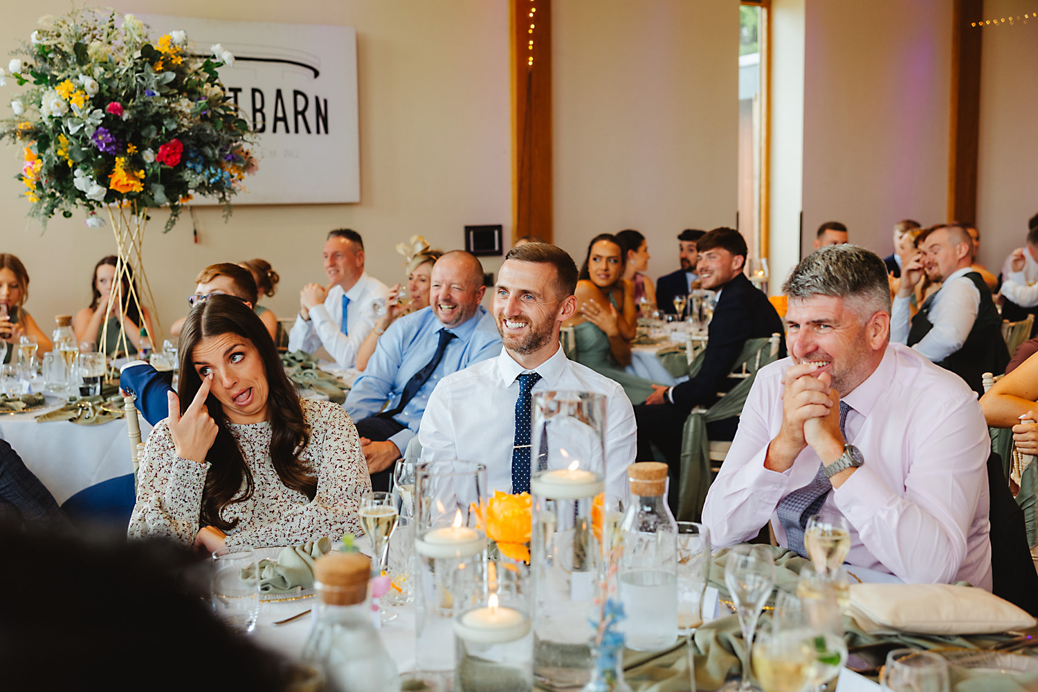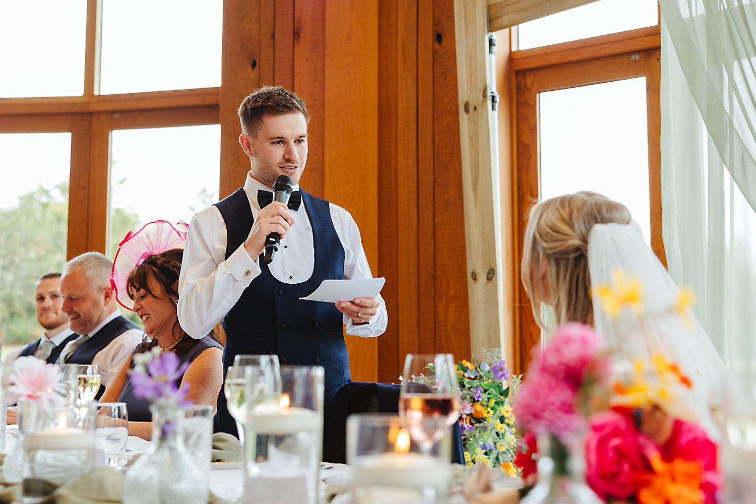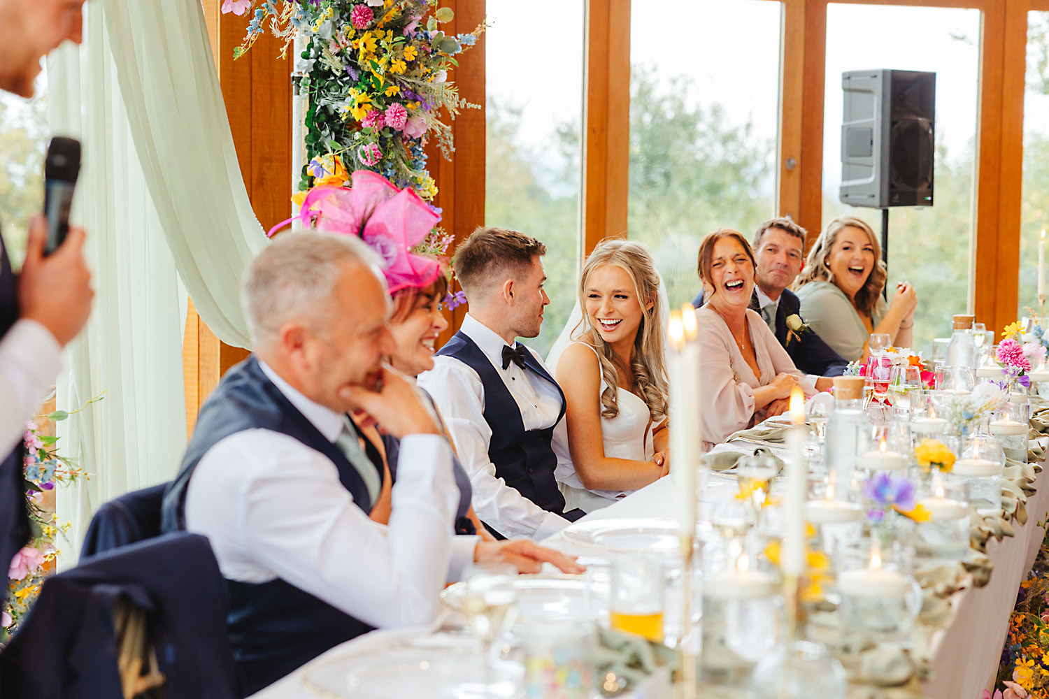 The venue was also dressed to perfection, with the most glorious colourful flowers, white linen, and sparkling glassware. It was great to get everyone outdoors, for some group shots, as the views are incredible from the Out Barn. Check out that blend of wildflower fields, manicured lawns, woodland areas, and incredible sweeping views. It really is the most magnificent venue.