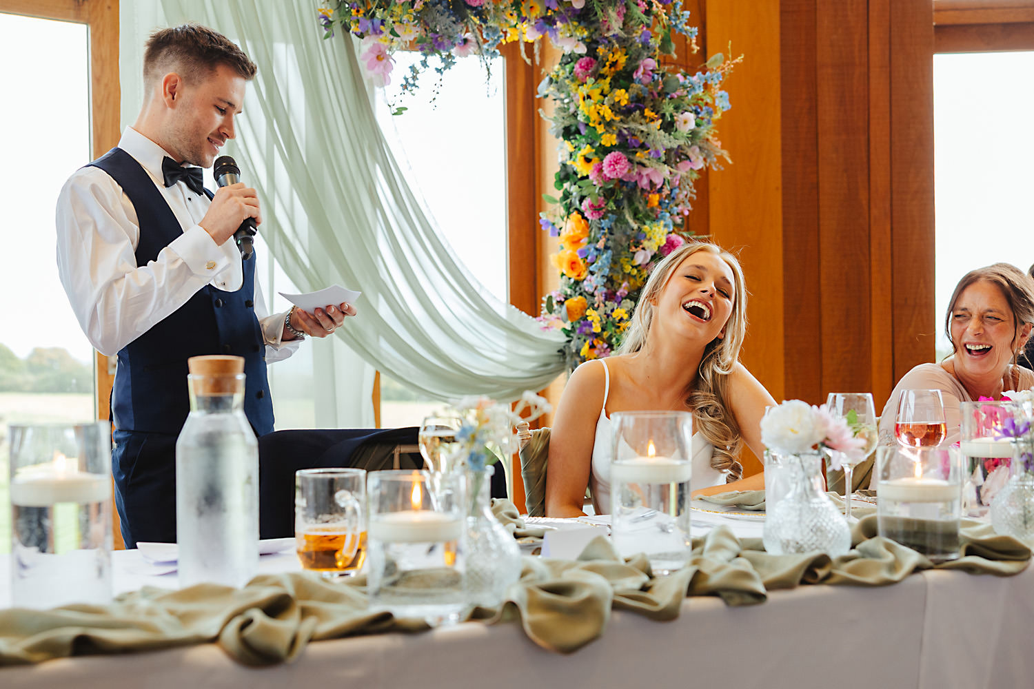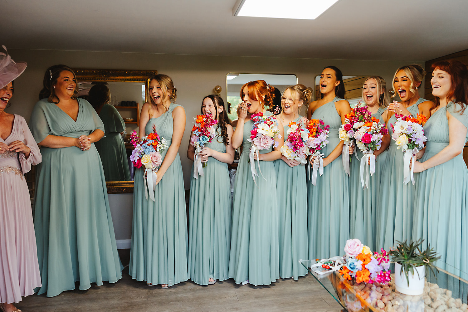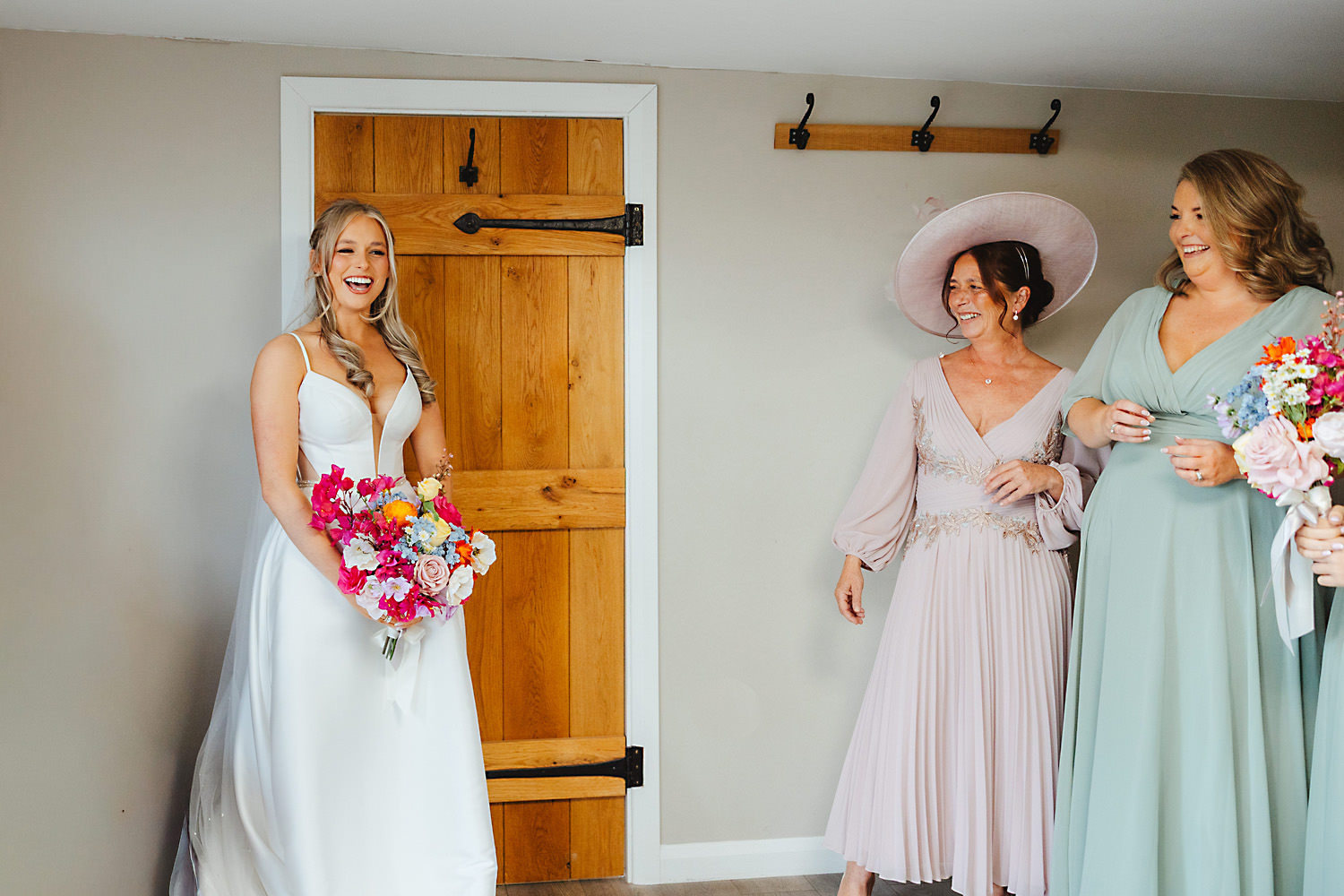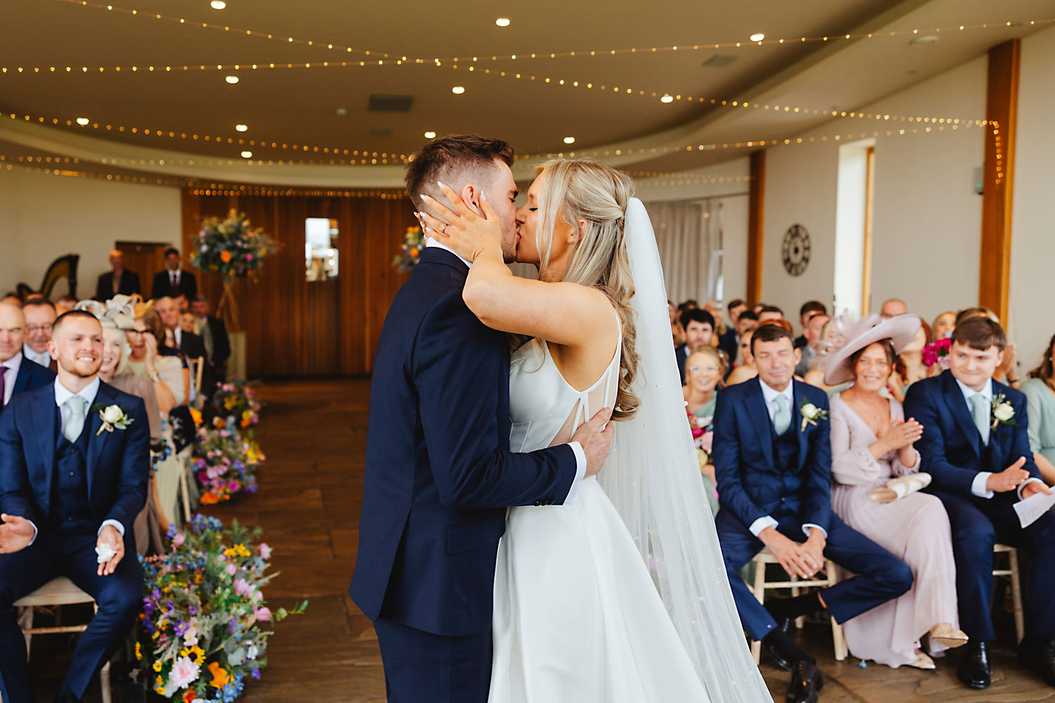 The venue was also dressed to perfection, with the most glorious colourful flowers, white linen, and sparkling glassware. It was great to get everyone outdoors, for some group shots, as the views are incredible from the Out Barn. Check out that blend of wildflower fields, manicured lawns, woodland areas, and incredible sweeping views. It really is the most magnificent venue.