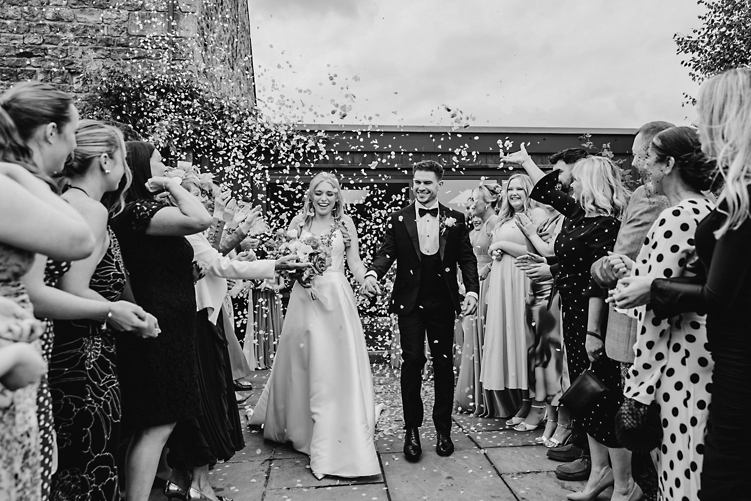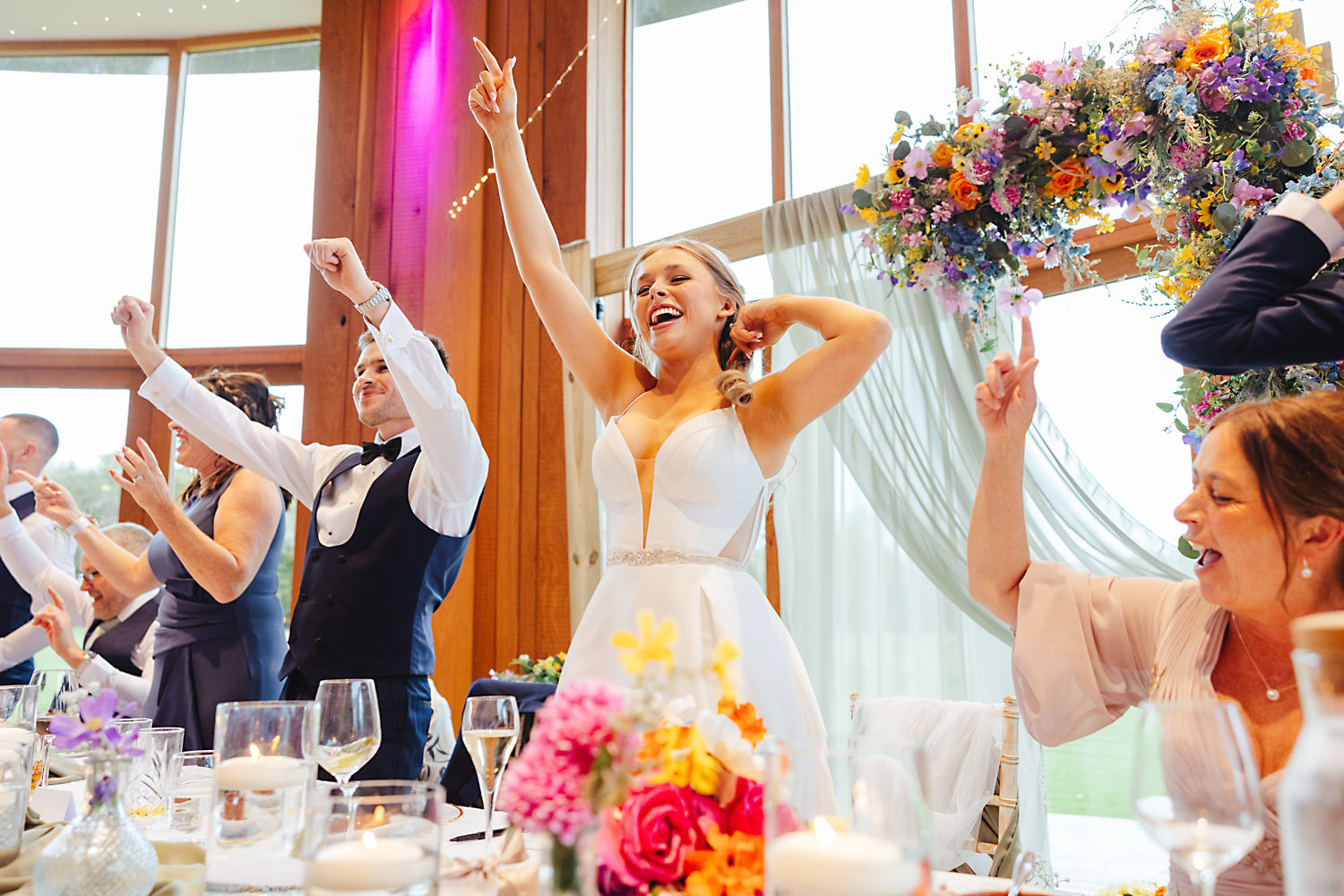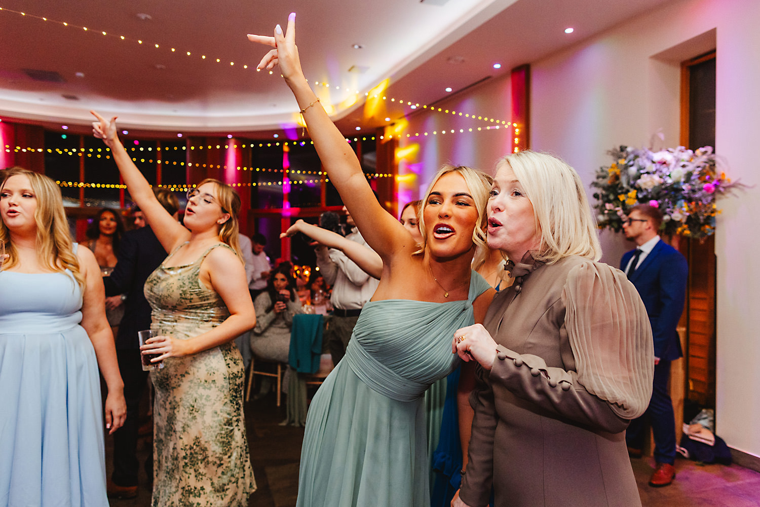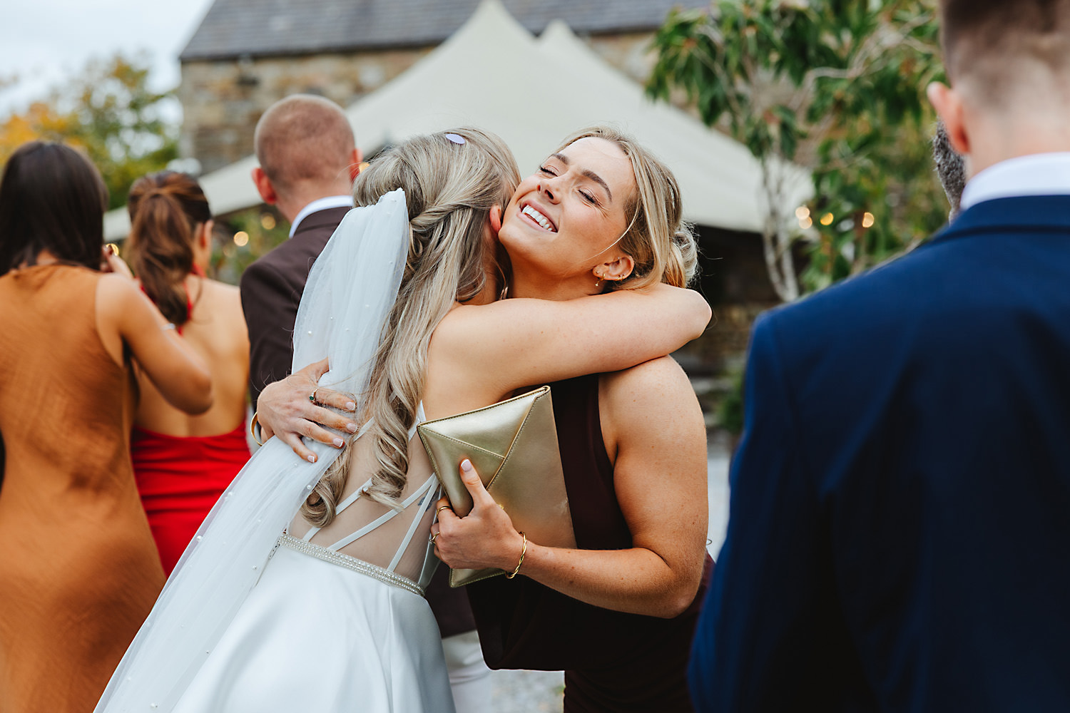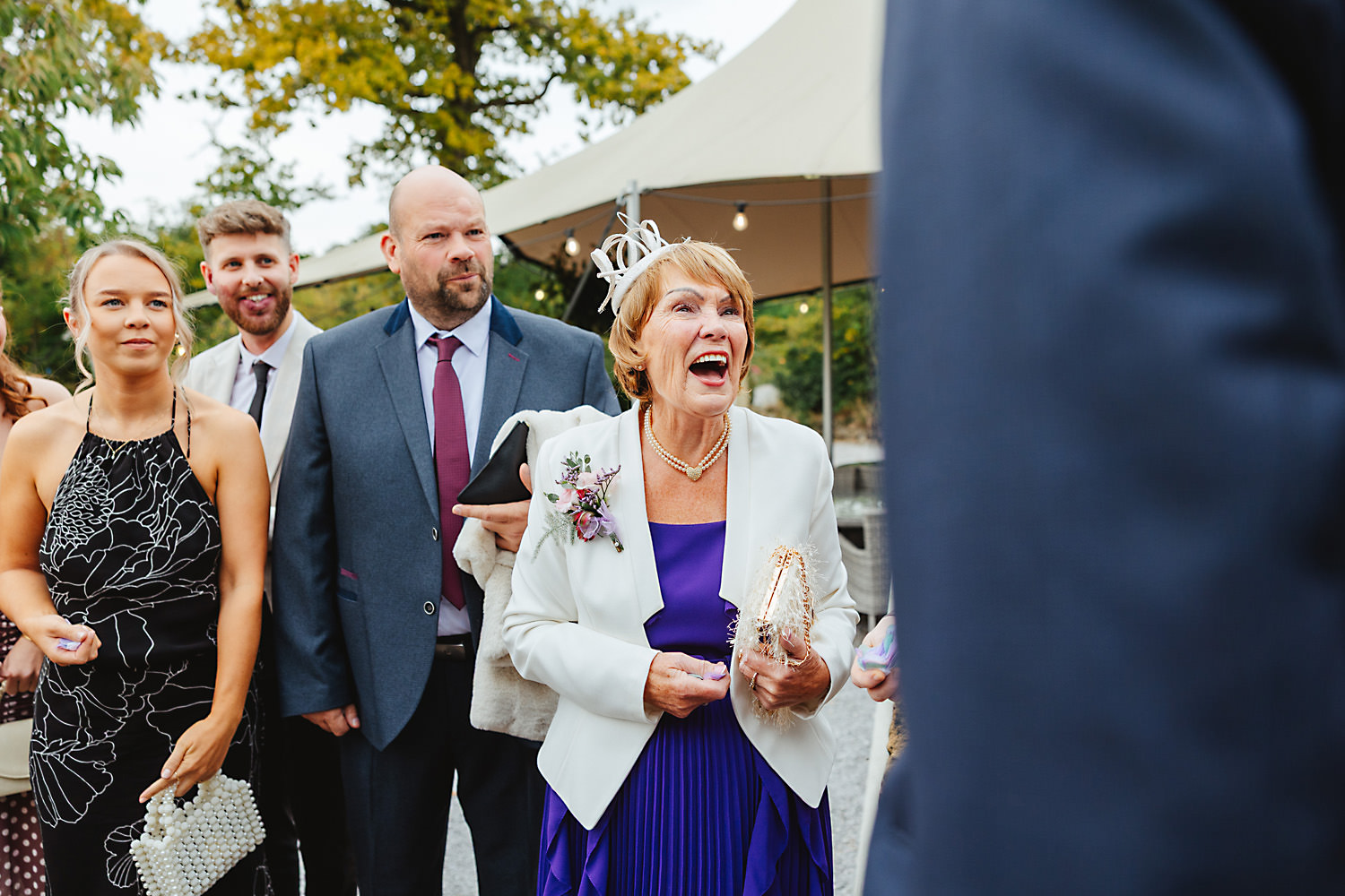 The venue was also dressed to perfection, with the most glorious colourful flowers, white linen, and sparkling glassware. It was great to get everyone outdoors, for some group shots, as the views are incredible from the Out Barn. Check out that blend of wildflower fields, manicured lawns, woodland areas, and incredible sweeping views. It really is the most magnificent venue.